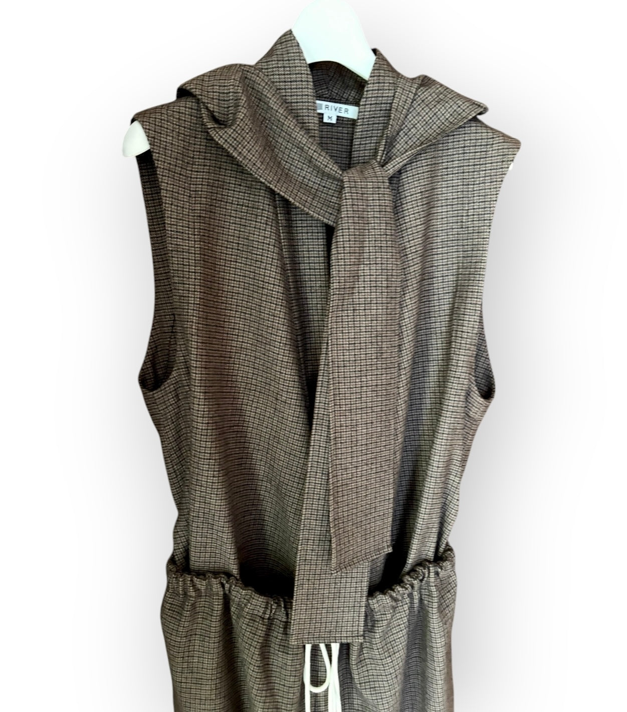 フロントトップはカシュクールタイプでウエストはゴムとドローコードでイージーに、そして取り外し可能なフード付きのサロペットになります。