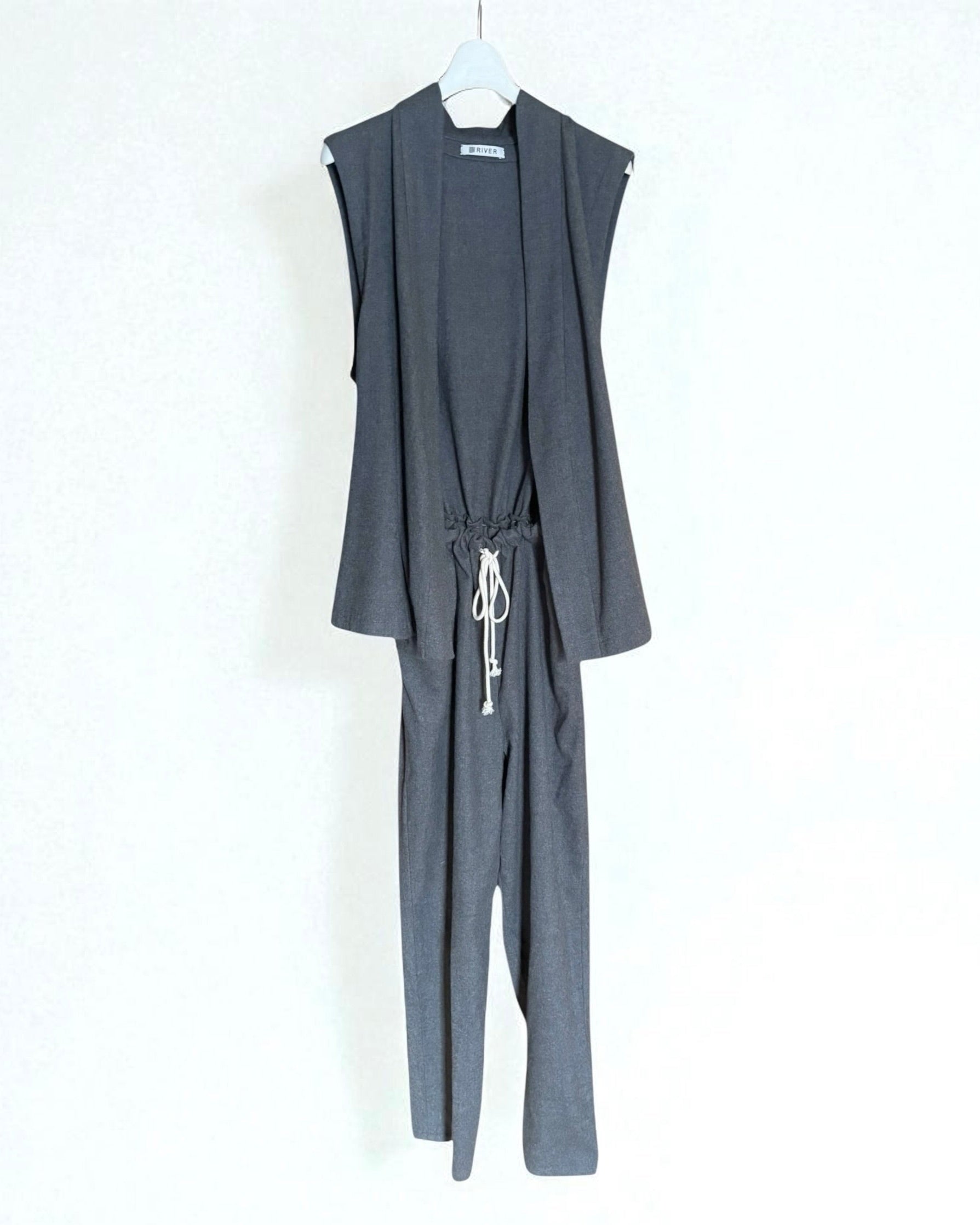 フロントトップはカシュクールタイプでウエストはゴムとドローコードでイージーに、そして取り外し可能なフード付きのサロペットになります。